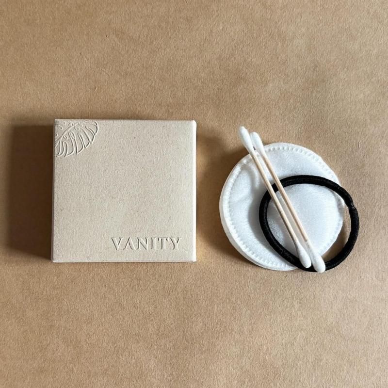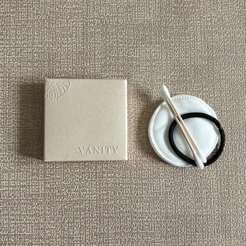 自然由来の生分解性コットンを使用したコットンパフに、天然木軸の綿棒とヘアゴムを組み合わせた、便利な1回使い切りのアメニティセットです。