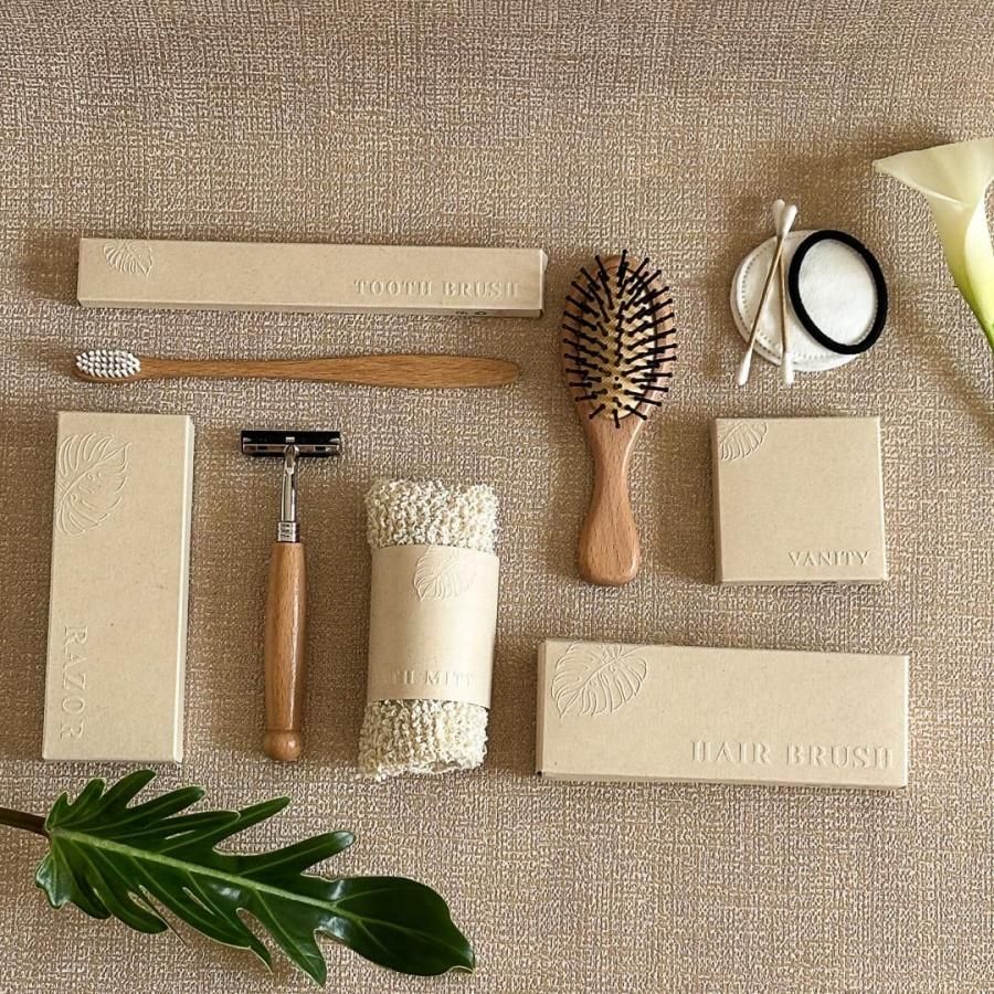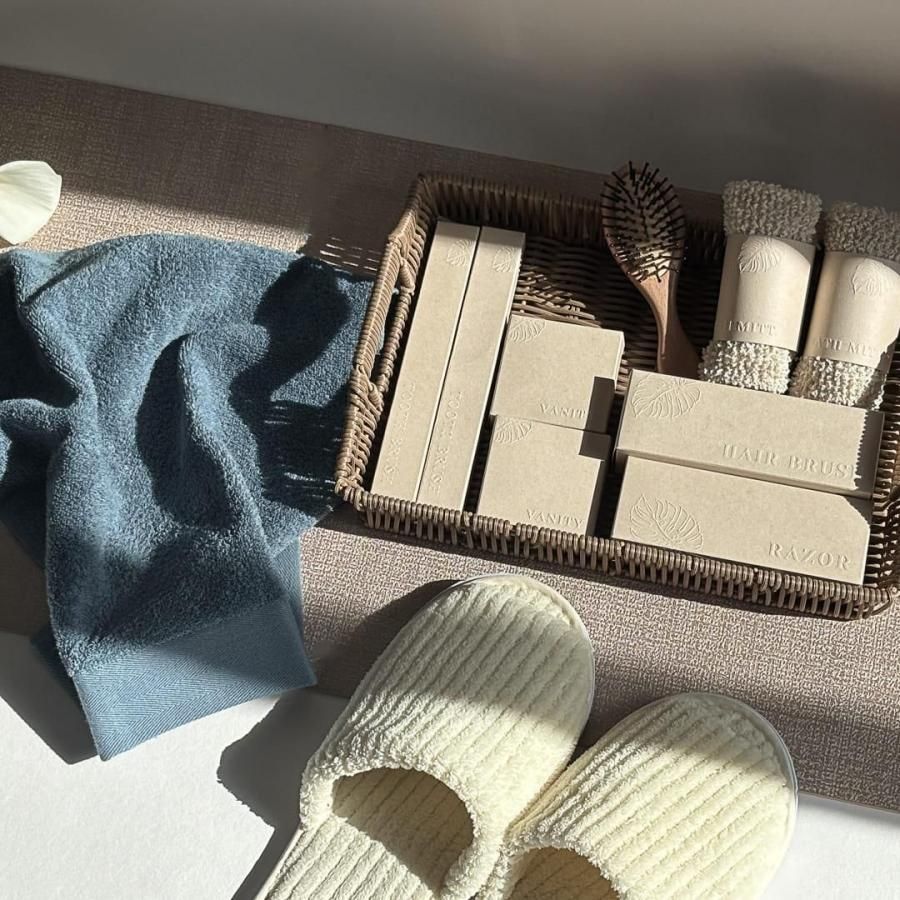 パッケージにはサトウキビ由来のバガス紙箱を使用し、廃棄後の環境負荷が小さいサステナブルなアメニティとして、ホテル・旅館・温浴施設・航空会社など幅広く採用いただけます。