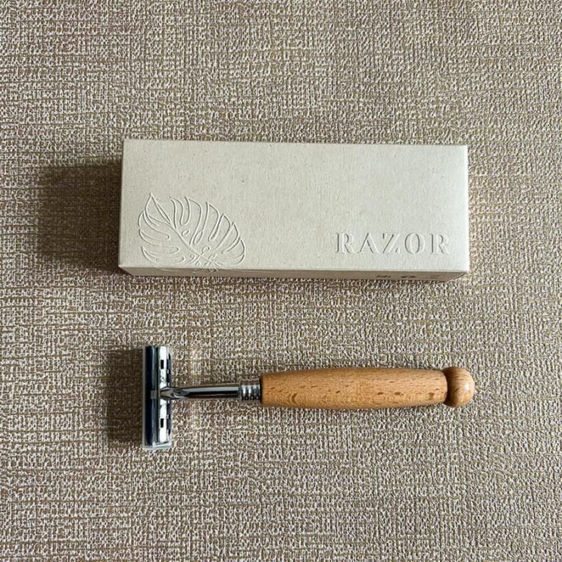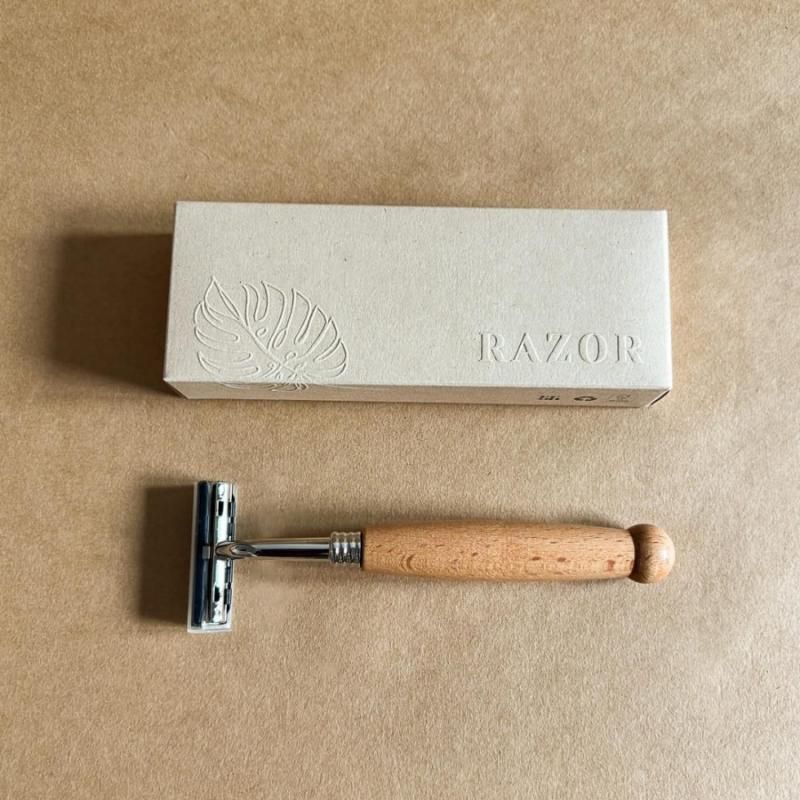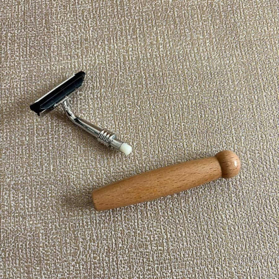 自然素材のブナ木とステンレス刃を使用した、環境に配慮した2枚刃カミソリです。ハンドル部分には落ち着いた木目のブナ材を採用しており、高級感と手になじむ滑らかな質感です。